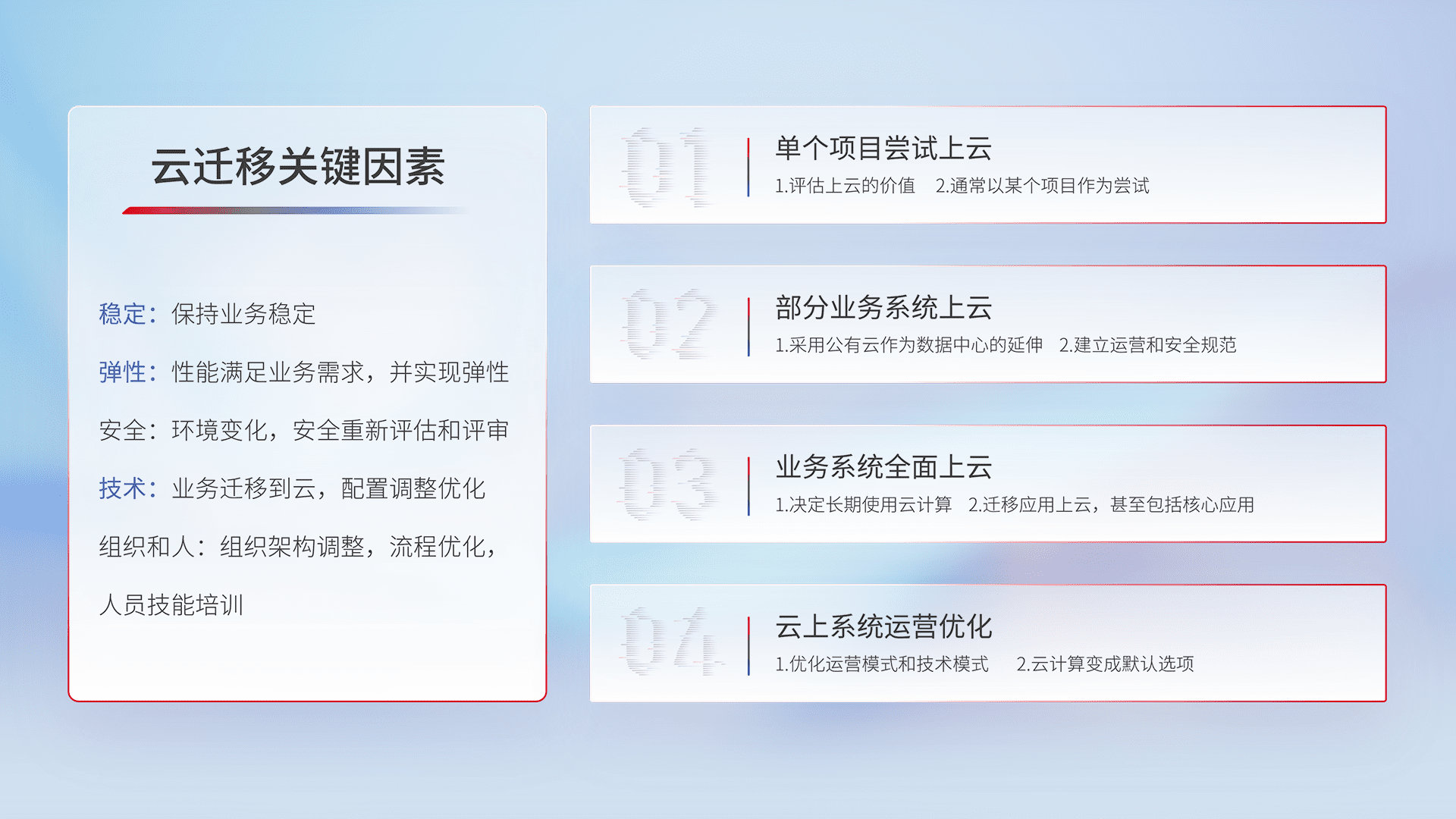 结合实际业务,,,从规划设计、、云平台选型、、、云原生改造、、数据迁移、、、集成交付,,,,迁移全过程为客户识别最佳上云路径,,,,做好风险识别管理,,设计网络架构、、、身份权限、、、、安全审计合规、、、、操作审计、、、、日志审计、、、、监控告警策略、、、多站点容灾设计等,,,,对云上基础设施进行整体规划,,,提升IT治理水平,,以满足弹性、、高可用、、高性能的需求。。。
