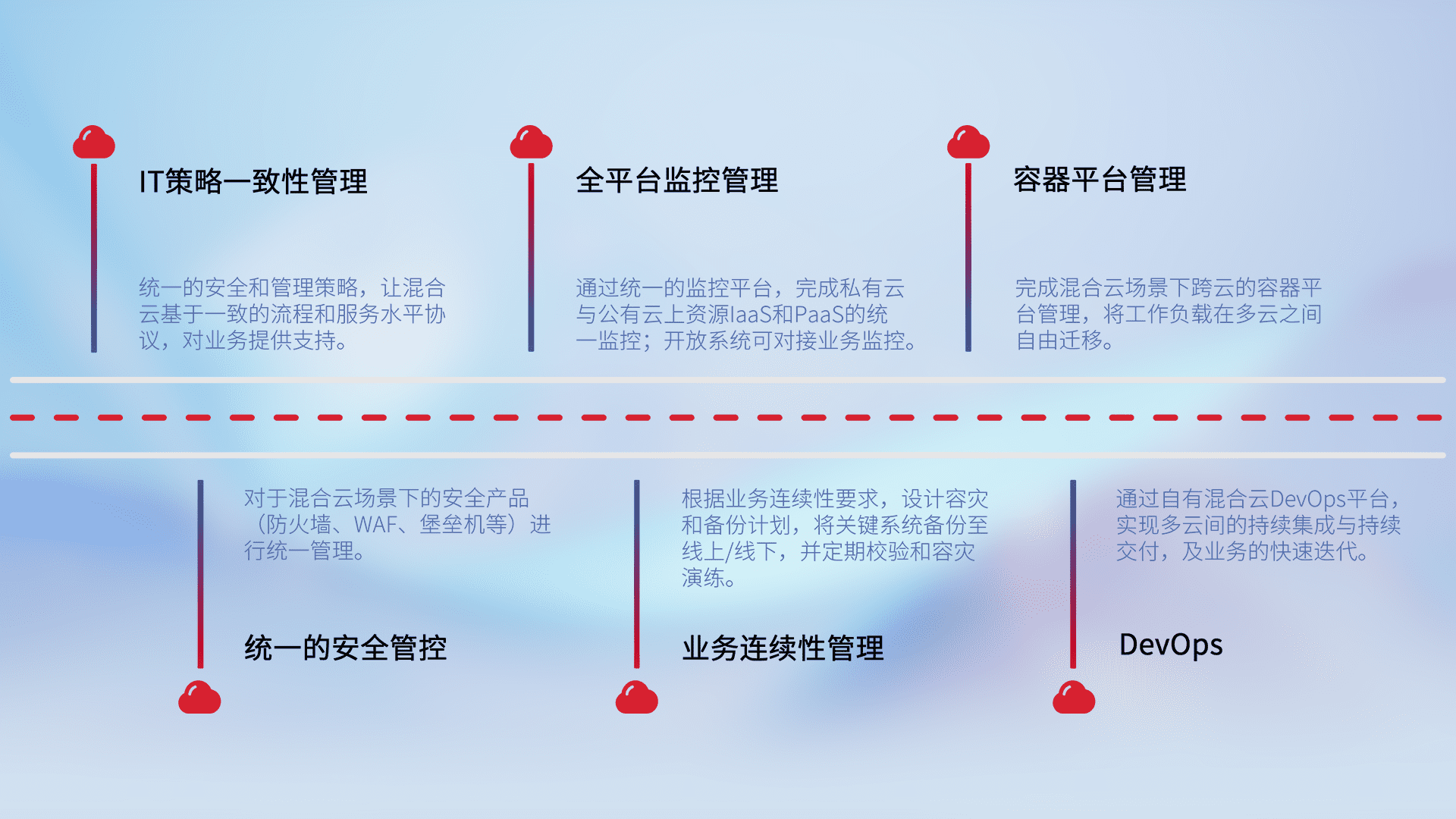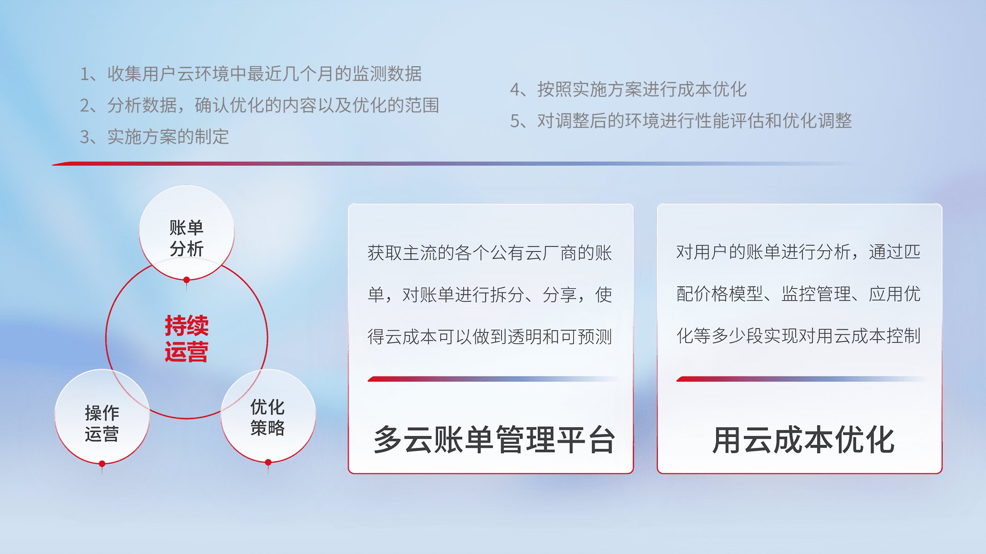 通过多云纳管,,以统一的资源数据模型把客户的云资源进行抽象和封装,,,,进而实现对多云资源的统一操作,,,保障云资源管理的可靠性、、、、稳定性与可用性。。量身定制化运维内容,,,,配置、、、、开发运维、、补丁管理、、、备份、、监控、、、认证和访问管理、、、审计和日常巡检等,,,保障在用云过程中的可靠度,,,稳定度以及高可用率。。