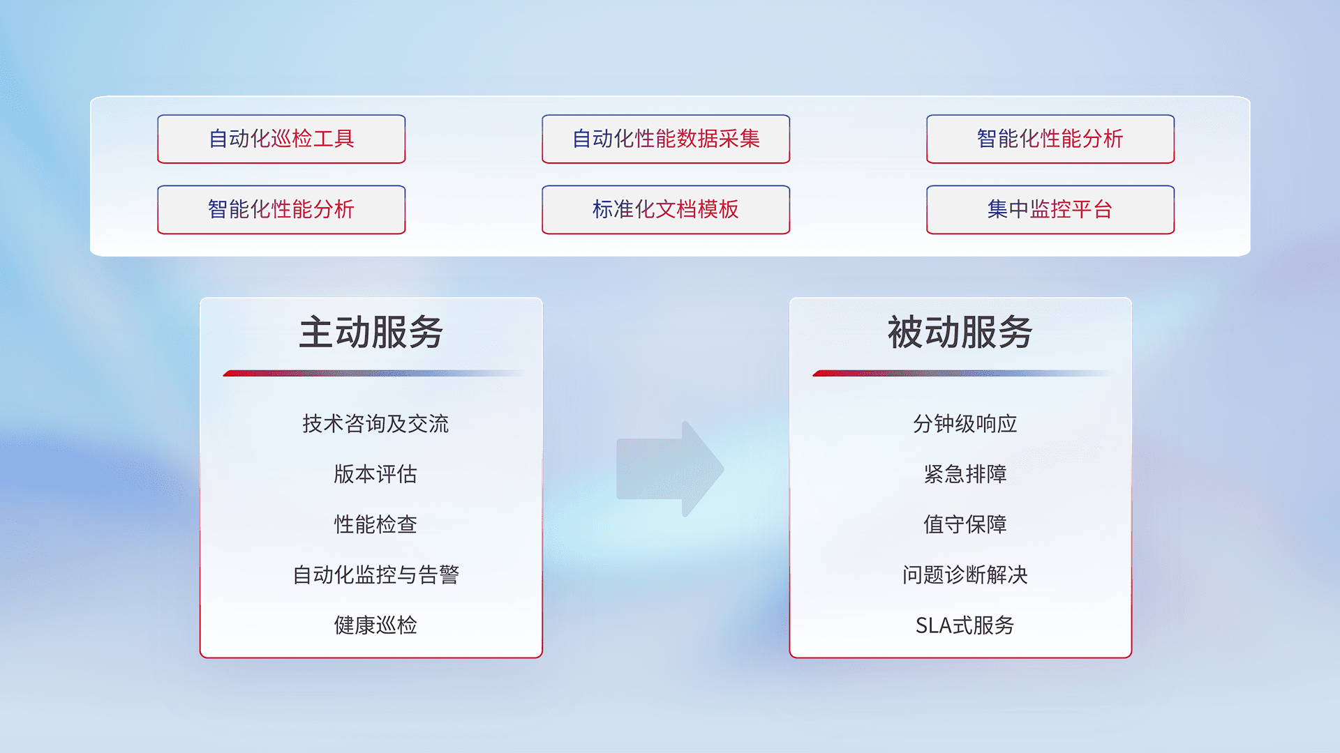 智能化工具和标准化文档,,,保障服务质量,,,提供主动服务(包含技术咨询、、、、版本评估、、、性能检查、、、、自动化监控与告警、、、、健康巡检)和被动服务包含(分钟级响应、、、、紧急排障、、、、值守保障、、、问题诊断解决、、、、SLA服务)。。