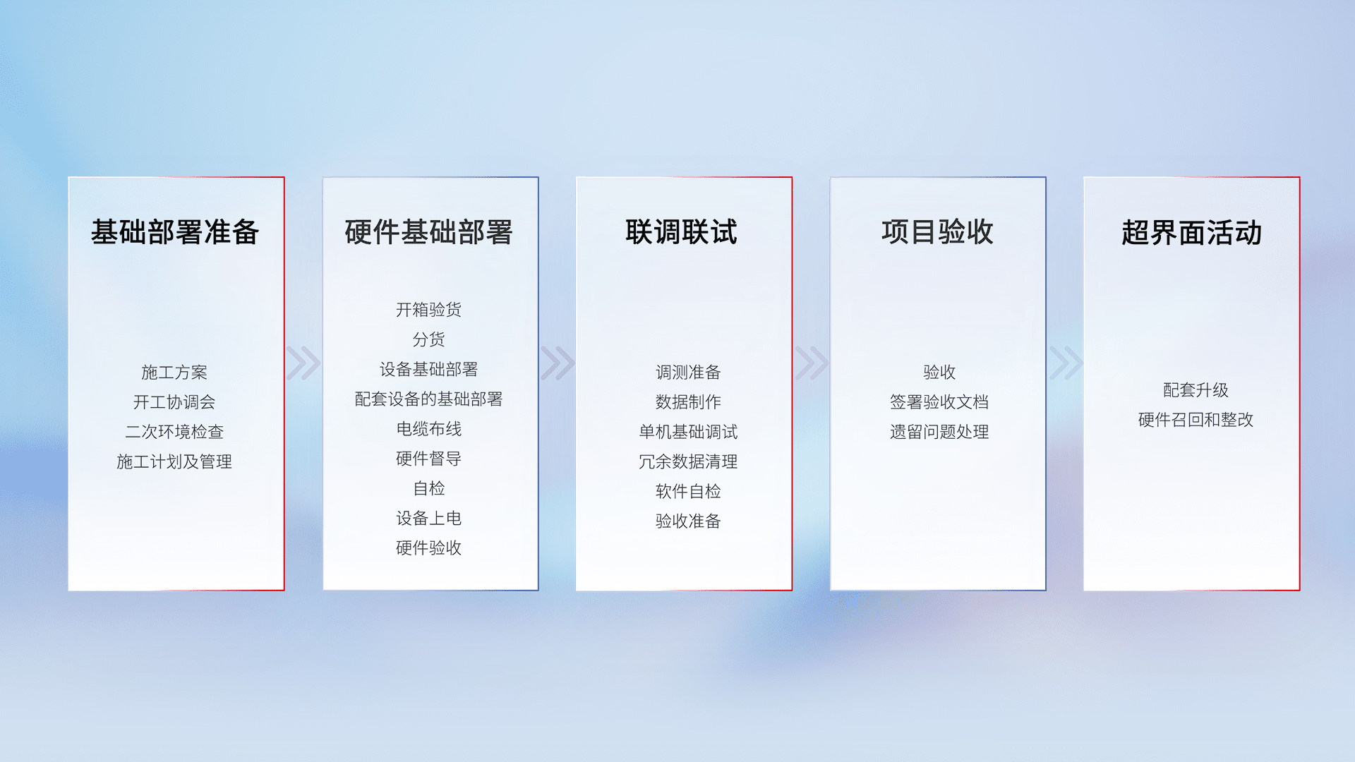 从基础部署准备、、硬件基础部署、、联调联试、、、项目验收、、越界面活动的全过程可追溯,,保证施工质量和进度。。。。